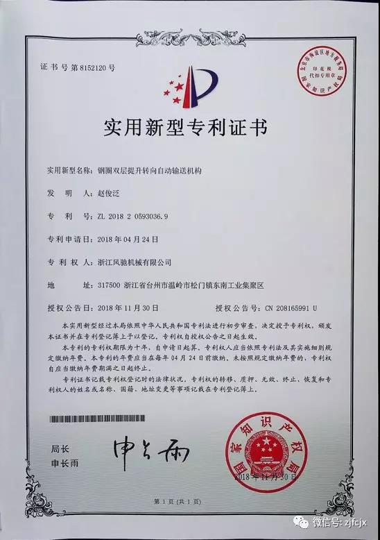 2018年11月榮獲“鋼圈雙層提升轉(zhuǎn)向自動輸送機構(gòu)”實用新型專利證書